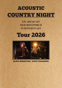 Die Acoustic Country Night, präsentiert von den aufstrebenden Singer-Songwriter*innen Alina Sebastian und David Tarakona. Die beiden entführen ihr Publikum in eine Welt handgemachter, authentischer Musik — ganz pur, akustisch und ehrlich.